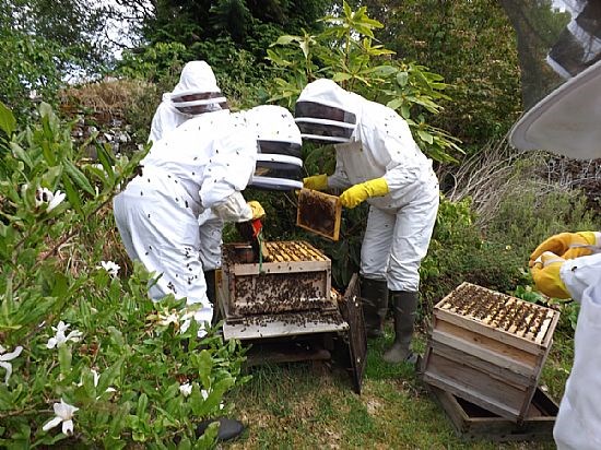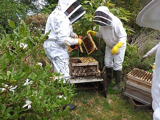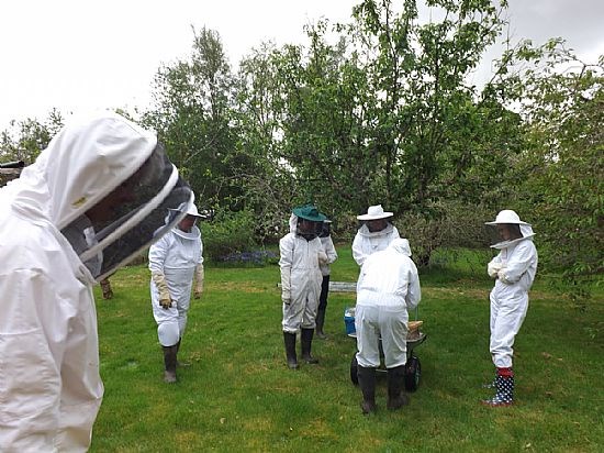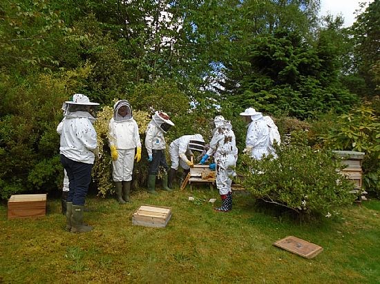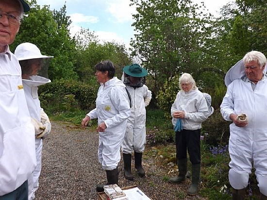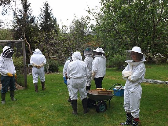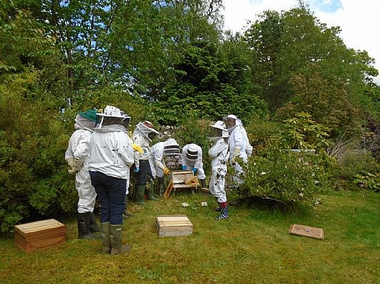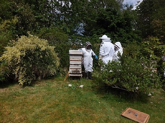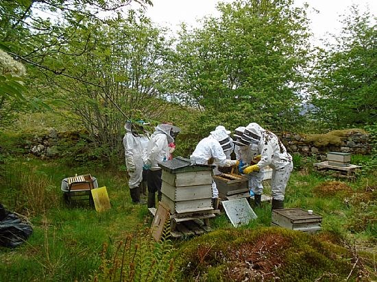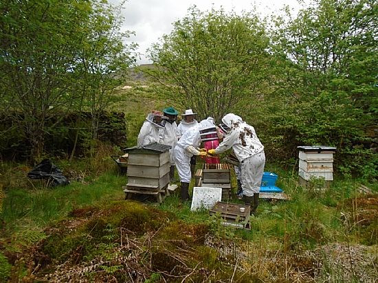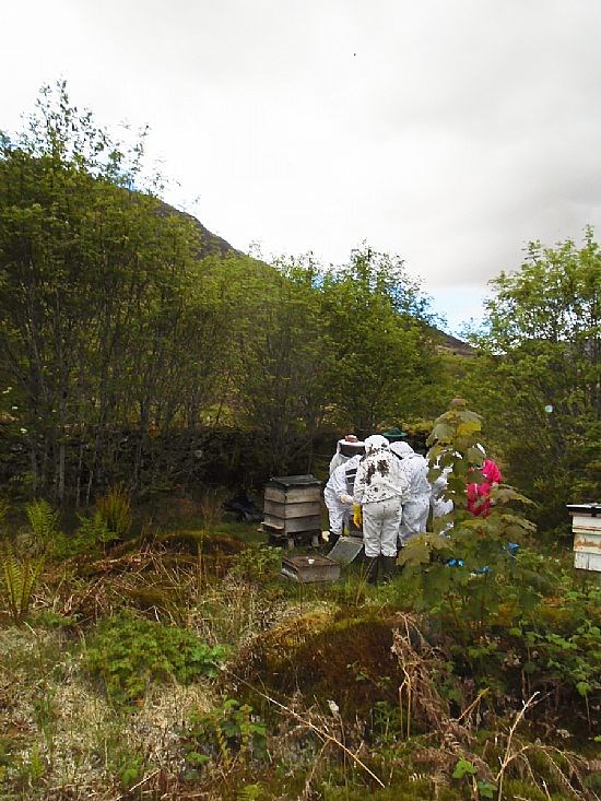 Okay so this is just another collection of white (and one pink one!) beesuits clustered around a hive but it does show what some of us get up to. We were invited to Kay Liston's apiary to meet up with beekeepers from Skye and Lochcarron to view Kay's efforts at applying the Demaree system to controlling swarming. And most impressive it was.