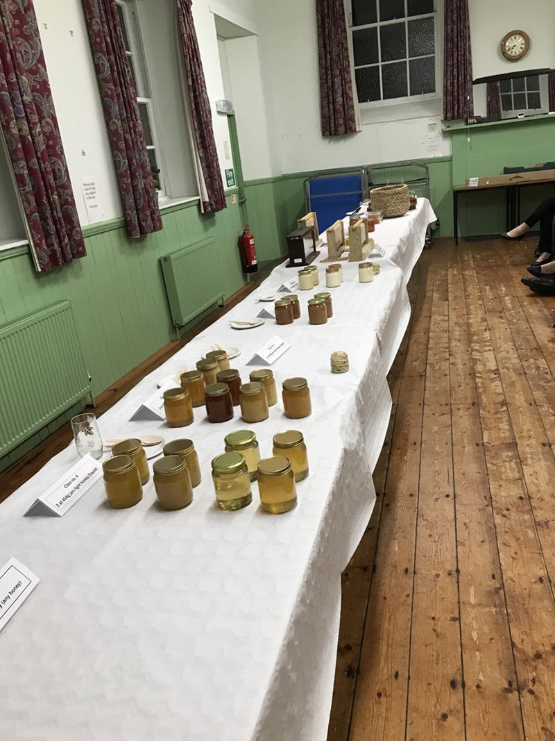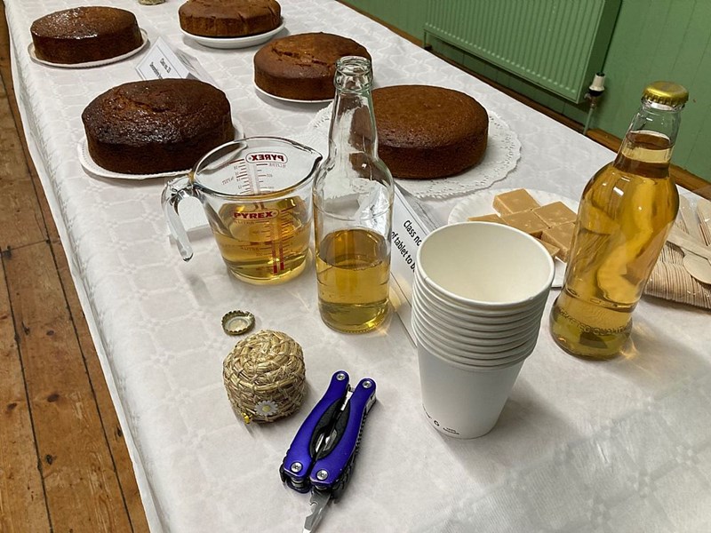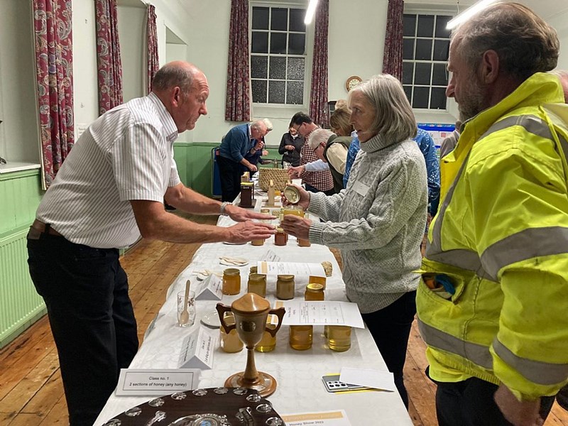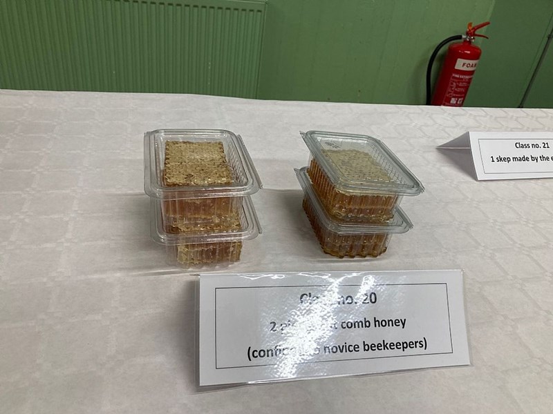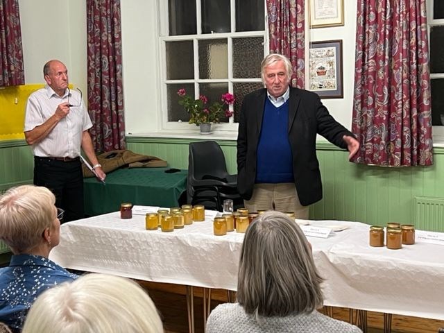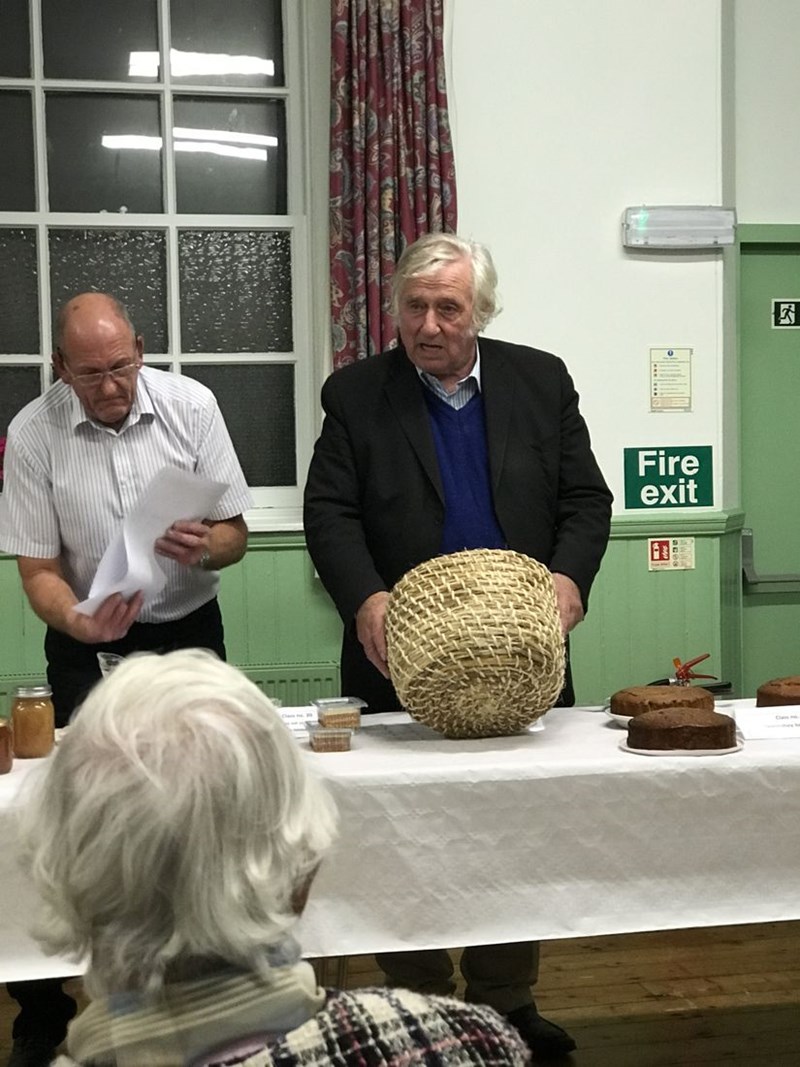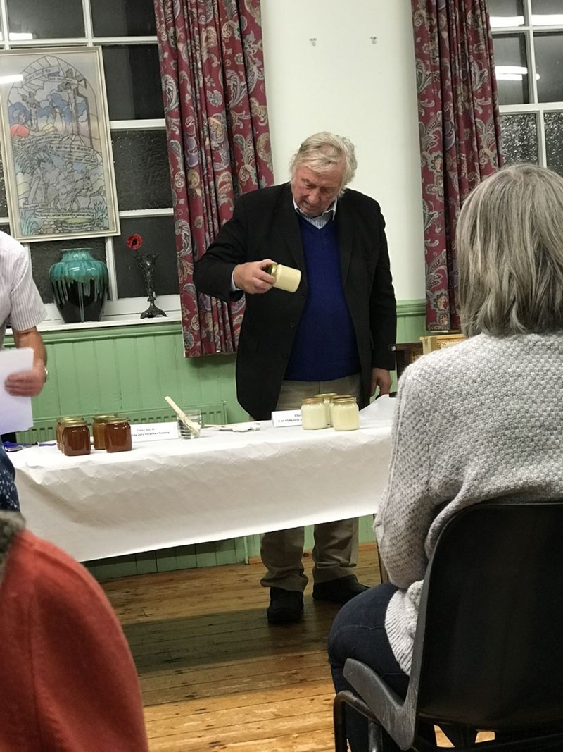 2022 Honey Show Willie Robson - our favourite judge. Jo Young receiving the Honey Cake shield Jo Young receiving the Novice Trophy Bill Cormack gained most points in Show and won Best in Show