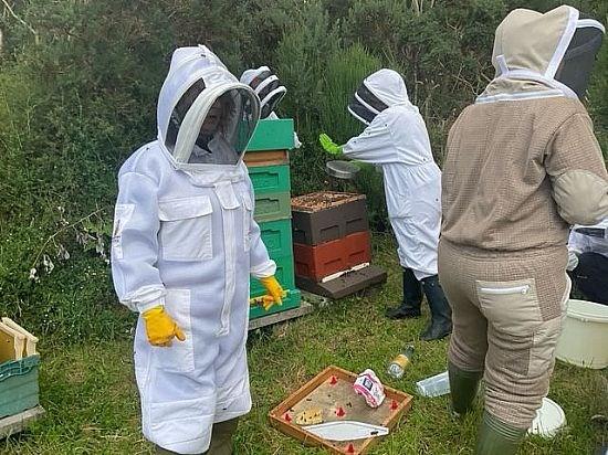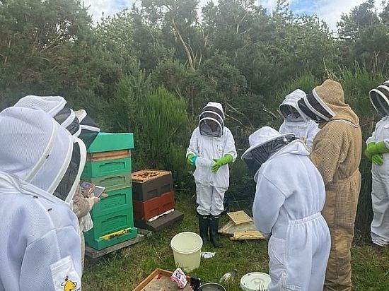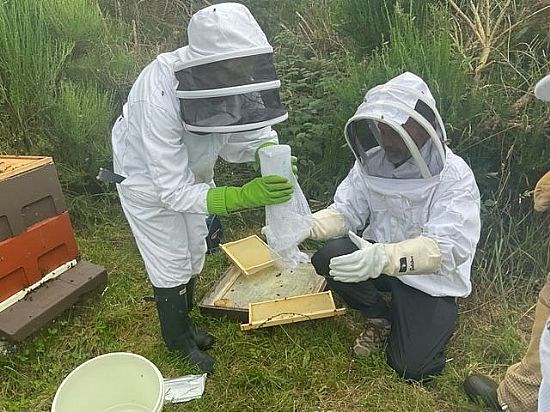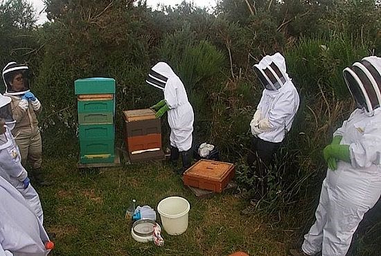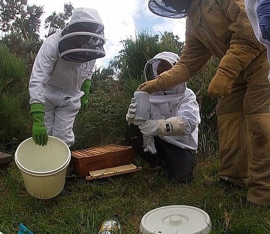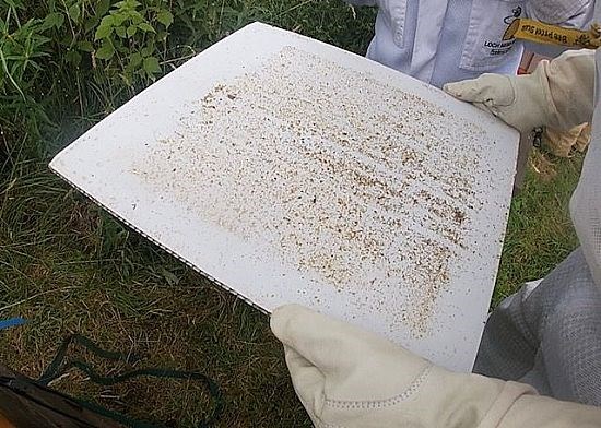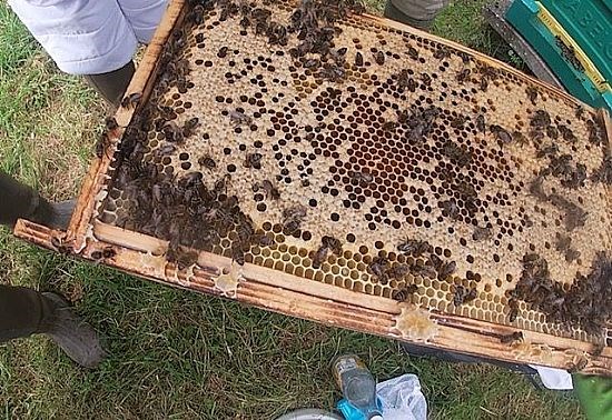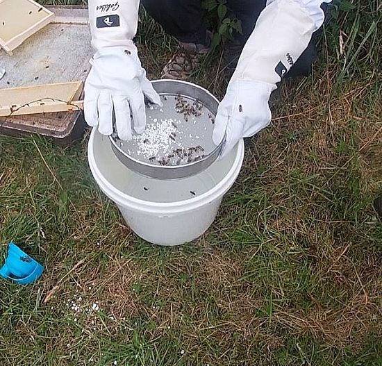 We checked the varroa boards, removed the honey (I had put in the clearer board the day before because I knew this hive needed to be treated), collected approximately 300 house bees via a bucket into a container marked at 100ml, (approximately 100 bees), sprinkled 2 tablespoons of icing sugar on them through a mesh cover, rolled the bees in it and left them for 5 minutes. Then sieved the bees out over a bucket of water to dissolve the icing sugar, returned the bees to the hive and counted the varroa floating in the water. This was more than 3% (3 mites per 100 bees) so we then used Formic Pro and discussed Apivar, Apistan and oxalic acid treatments and looked at the basic and high-end methods of vapourisation. 5% infestation would indicate an urgent need to treat. See last photograph in Gallery.